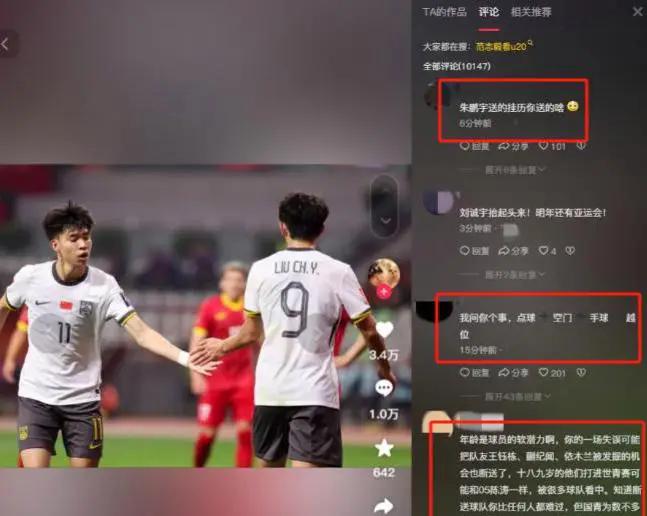 刘诚宇的社交媒体账号被攻击着问道:“究竟压了多少钱?”从比赛表现来看,刘诚宇的表现确实令人失望。赛后他在更衣室内痛哭,因为两次必进的机会都被浪费掉了。中国队在这场比赛中恰如足球界所说的经典法则:错失机会就会受到惩罚。错失一个点球和一个空门进球机会,抑制了刘诚宇自身的锐气,降低了球队的信心,因为一场比赛中的绝对机会并不多。有些球迷认为,面对这样的表现,接受指责是正常的。